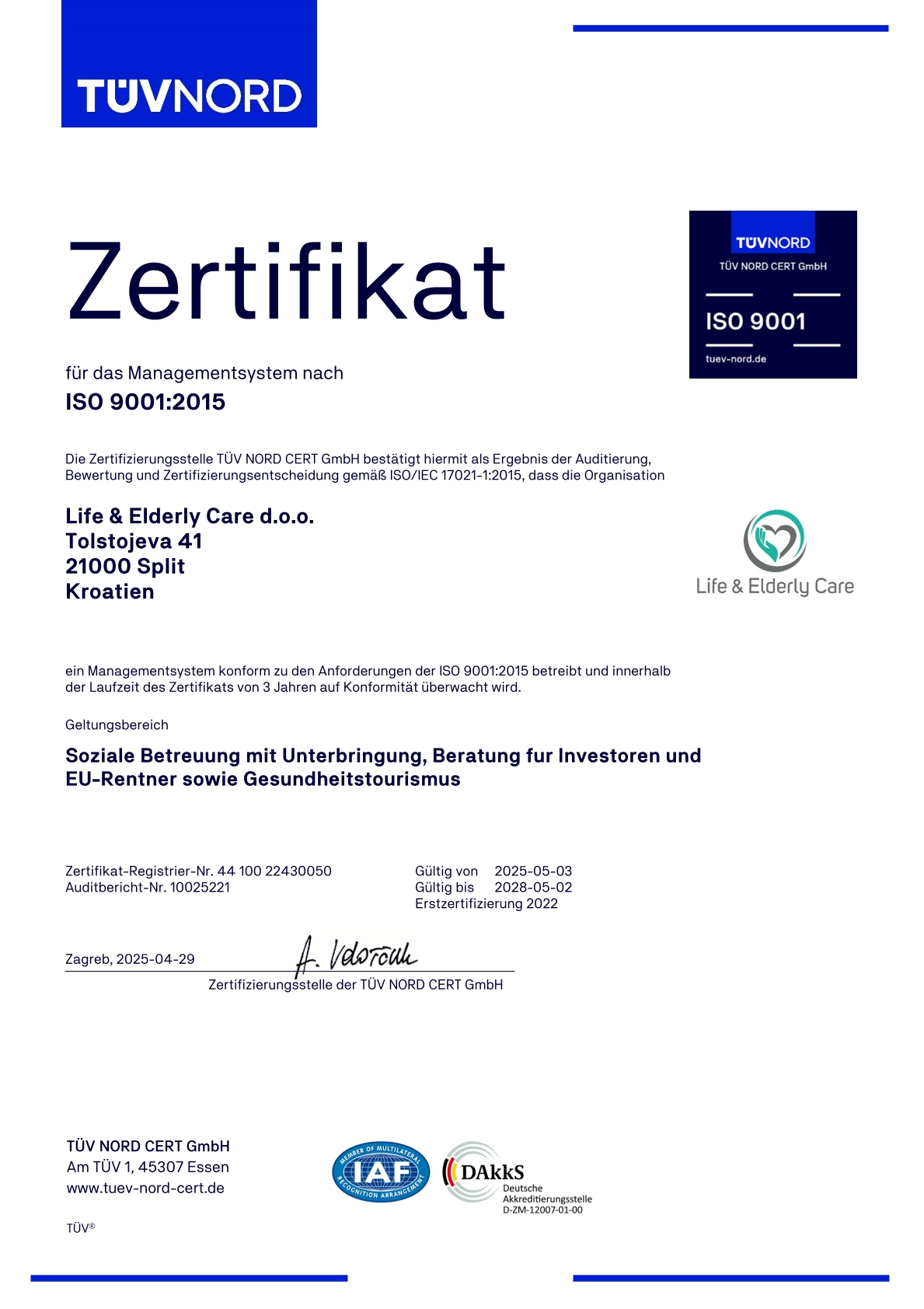 Life & Elderly Care d.o.o. ist ein verlässlicher Partner und Koordinator im Bereich Gesundheit, Pflege und Seniorentourismus – mit dem Ziel, Kroatien als erstklassige Gesundheits- und Reha-Destination in Deutschland nachhaltig zu etablieren.